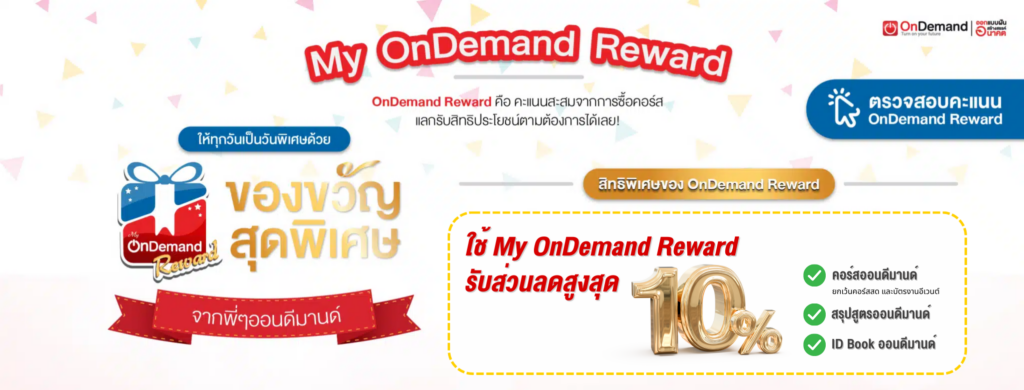 - คะแนนสะสม My OnDemand Reward ใช้เป็นส่วนลดเฉพาะคอร์สเรียนออนดีมานด์ (คอร์สเดี่ยวและคอร์สแพค), สรุปสูตรออนดีมานด์, และ ID Book ออนดีมานด์